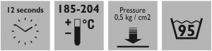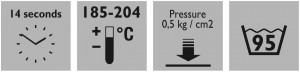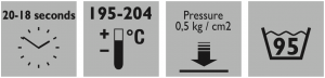 | Type of fabric | Temp. °C | Pressing time in sec. | Pressure in Bar Low/Medium/High |
