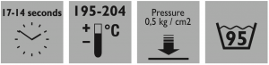 | Type of fabric | Temp. °C | Pressing time in sec. | Pressure in Bar Low/Medium/High |